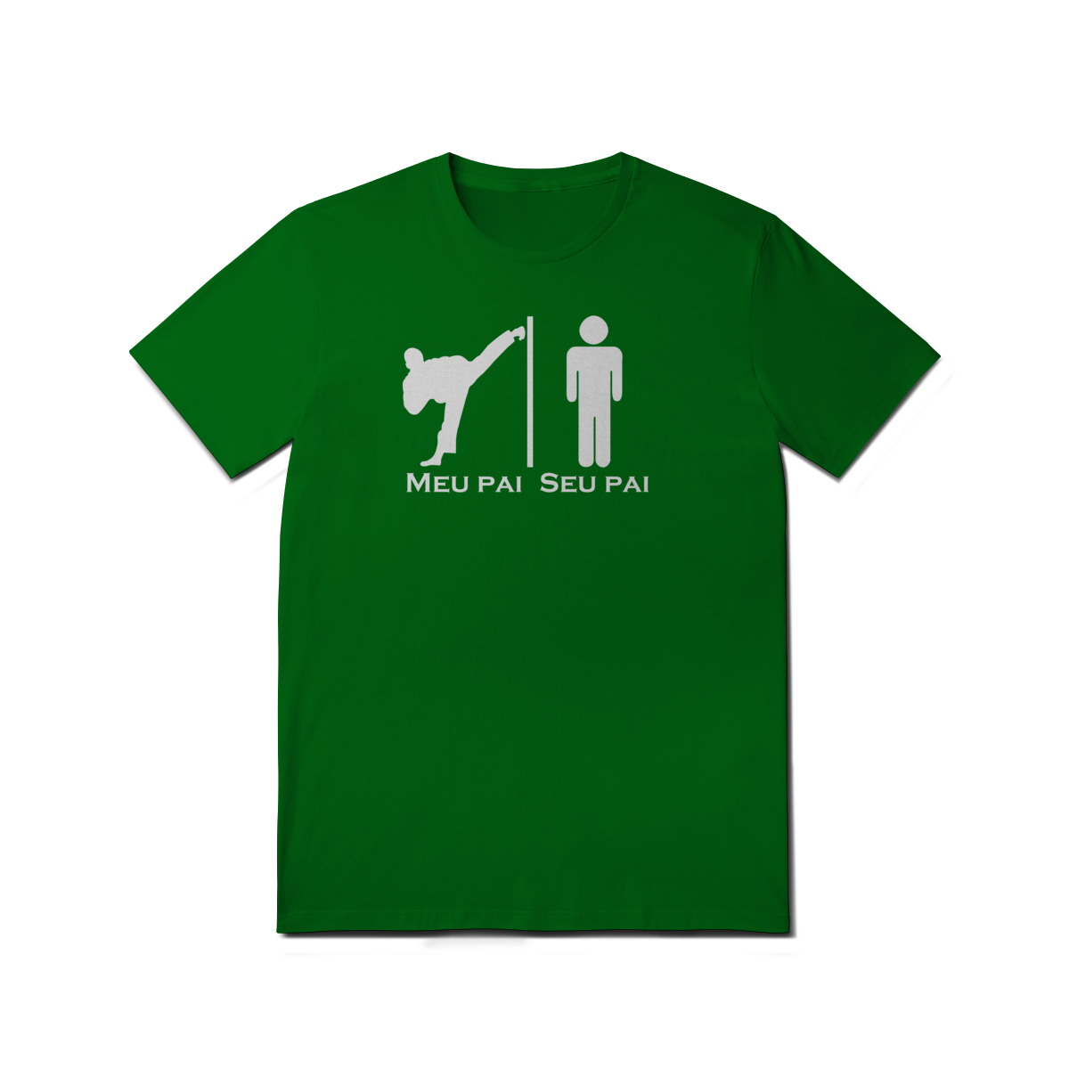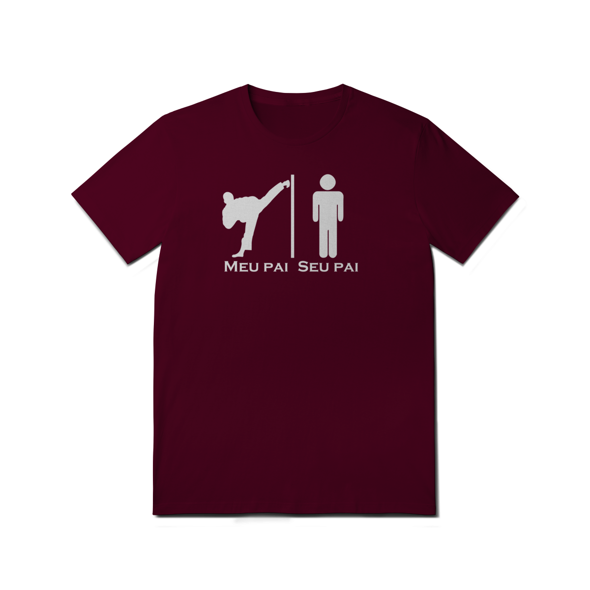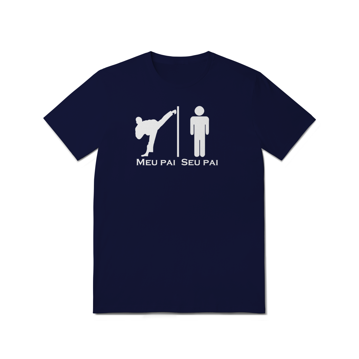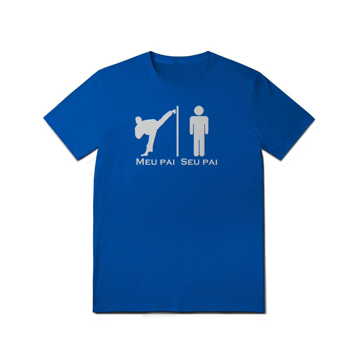 A camiseta “Meu Pai / Seu Pai” é daquelas que falam tudo sem precisar de legenda. A estampa coloca lado a lado dois ícones simples — mas o impacto é imediato: de um lado, o pai atleta aplicando um chute alto que faria qualquer faixa preta sorrir; do outro, o bonequinho neutro de placa de banheiro. Resultado? Humor na veia e orgulho estampado no peito.