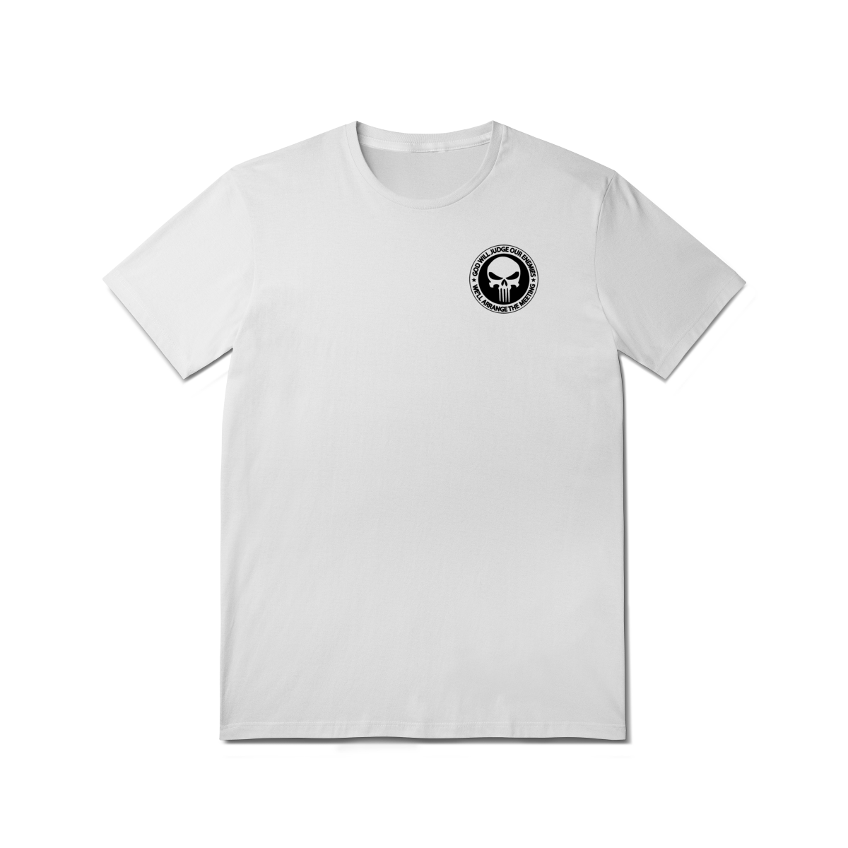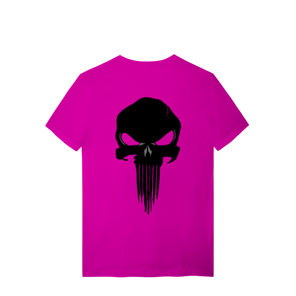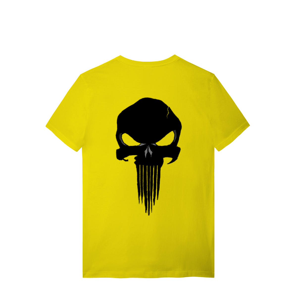 A estampa em alto contraste se destaca no tecido branco como uma marca de confronto. Não é decoração. É identidade. O design alongado do crânio cria uma sensação de movimento, como se a própria sombra estivesse escorrendo pela camiseta, lembrando que algumas histórias não são sobre heróis… são sobre limites.