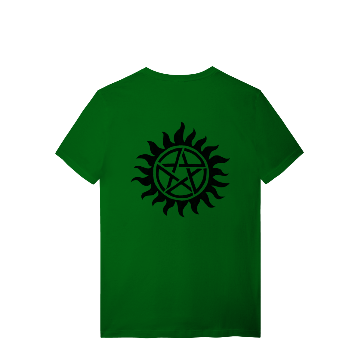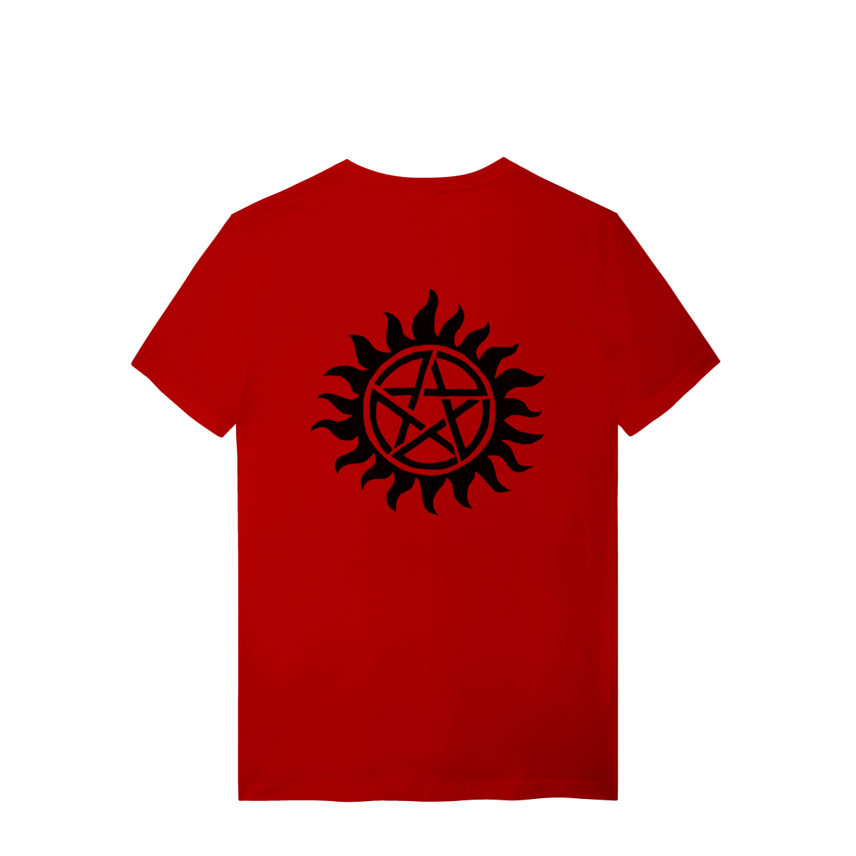 O design traz o emblema icônico da série em destaque, carregando toda a energia de proteção, mistério e estrada infinita. É uma estampa que não grita, mas invoca — reconhecida de longe por quem viveu cada caçada ao lado dos irmãos Winchester.
