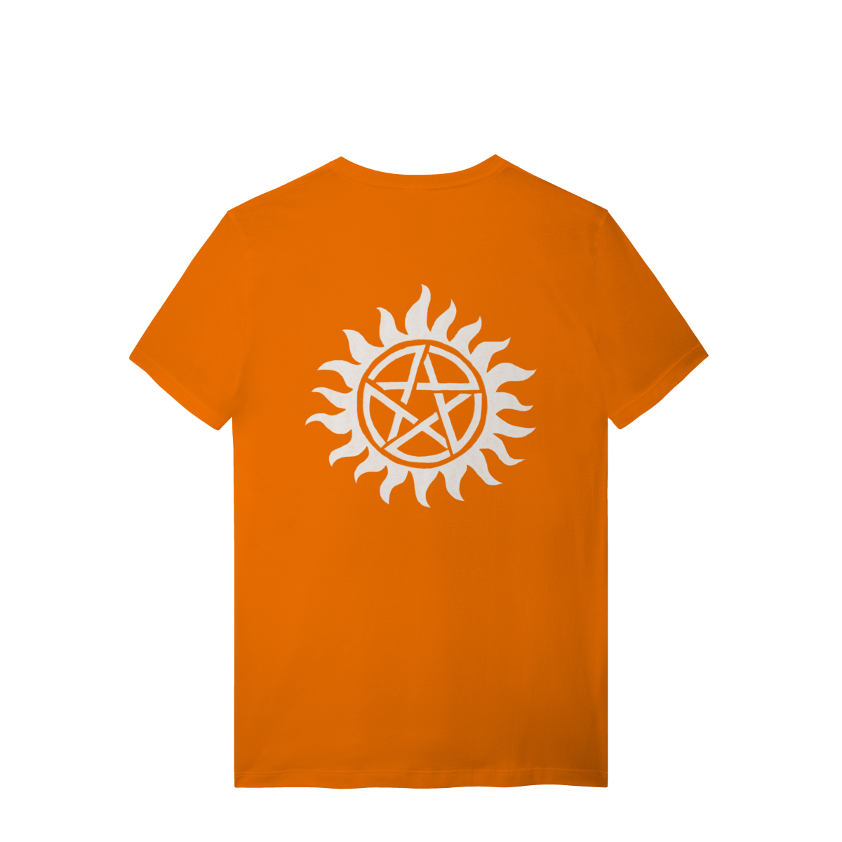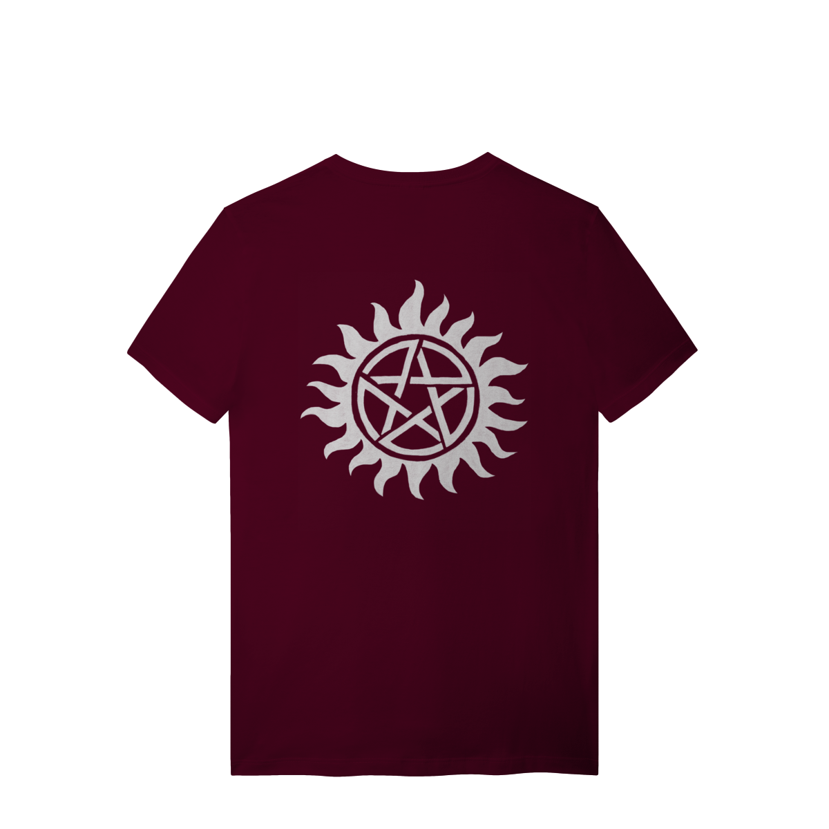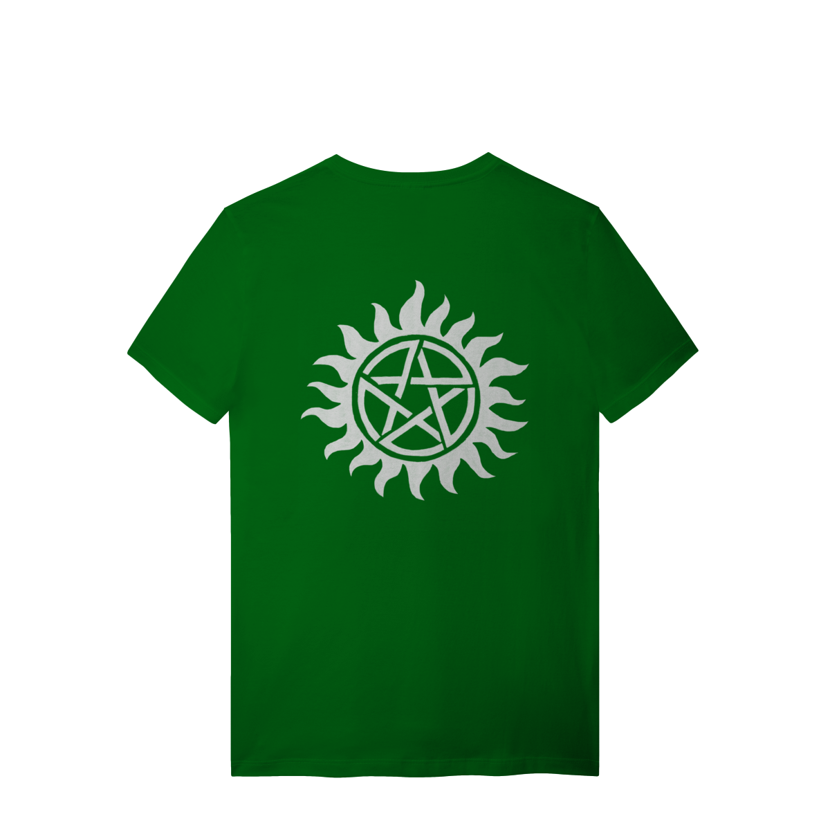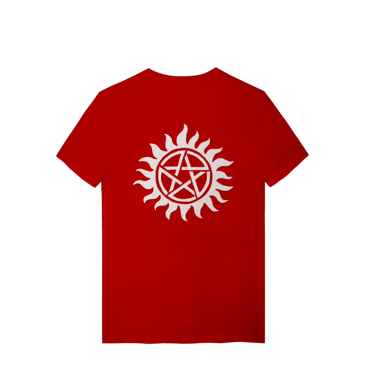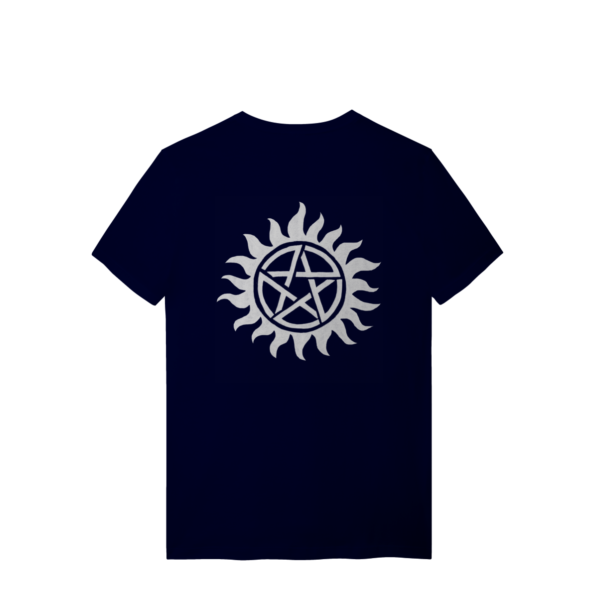 O design traz o emblema icônico da série em destaque, carregando toda a energia de proteção, mistério e estrada infinita. É uma estampa que não grita, mas invoca — reconhecida de longe por quem viveu cada caçada ao lado dos irmãos Winchester.